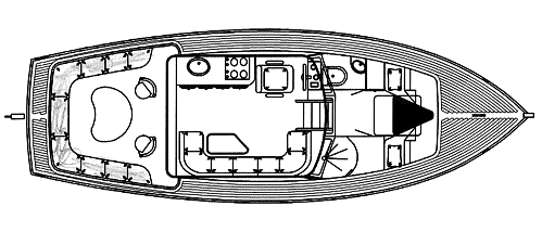 Aansluitend aan de ruime open kuip stap je in de stuurhut. Hier bevindt zich een stuurconsole en een zitbank. In de roef is ruimte voor een keuken, een toilet en twee ruime zit/slaapbanken met een tafel. Eventueel kan nog een zg. hondenkooi gemaakt worden door gebruik te maken van de ruimte in de stuurhut en de stuurboord bank van de kuip.